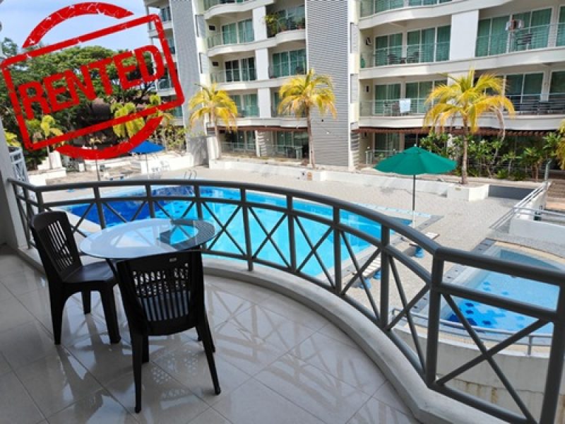 The main bedroom has a king-sized bed, and the guest bedroom has a queen. Both bedrooms have good-sized wardrobes and a side table. The living room is bright and spacious and has a view of the swimming pool.
