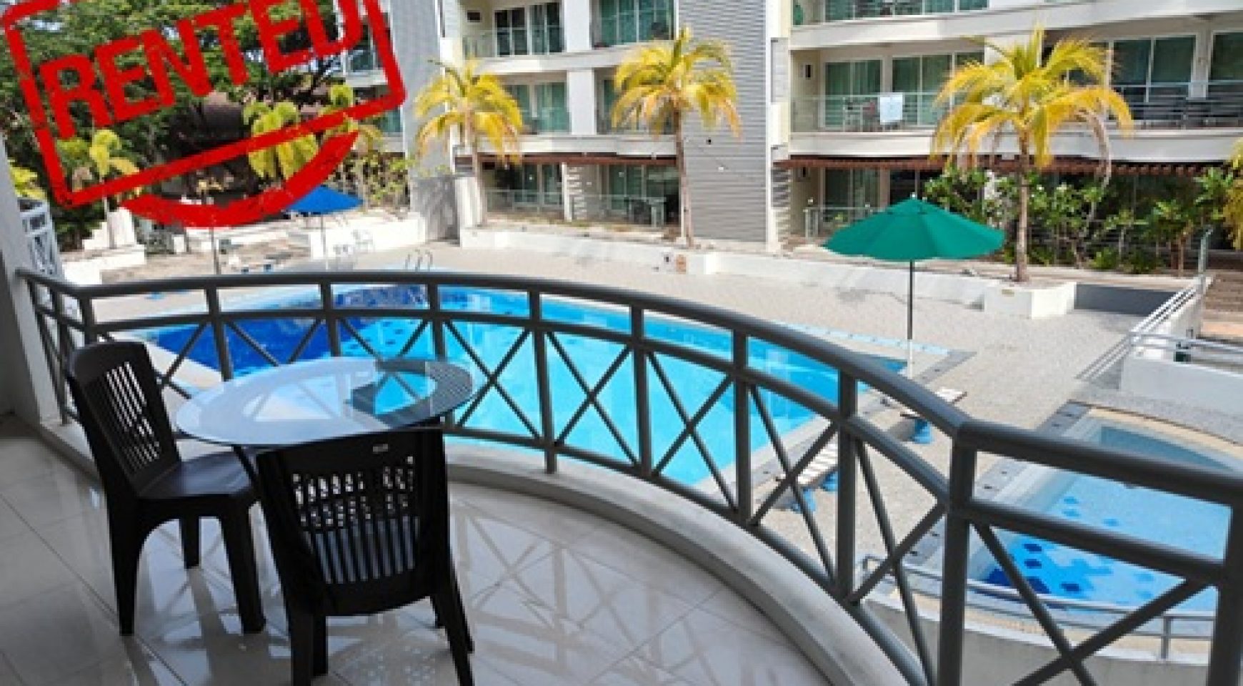 The main bedroom has a king-sized bed, and the guest bedroom has a queen. Both bedrooms have good-sized wardrobes and a side table. The living room is bright and spacious and has a view of the swimming pool.