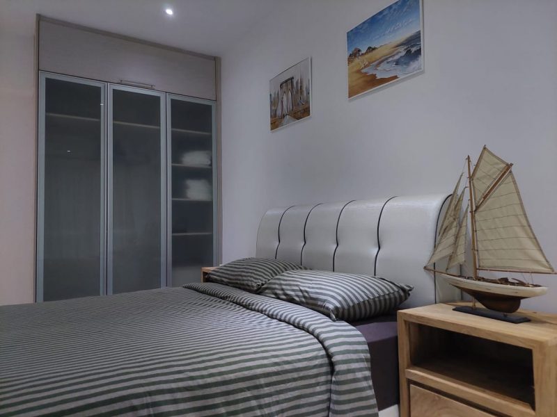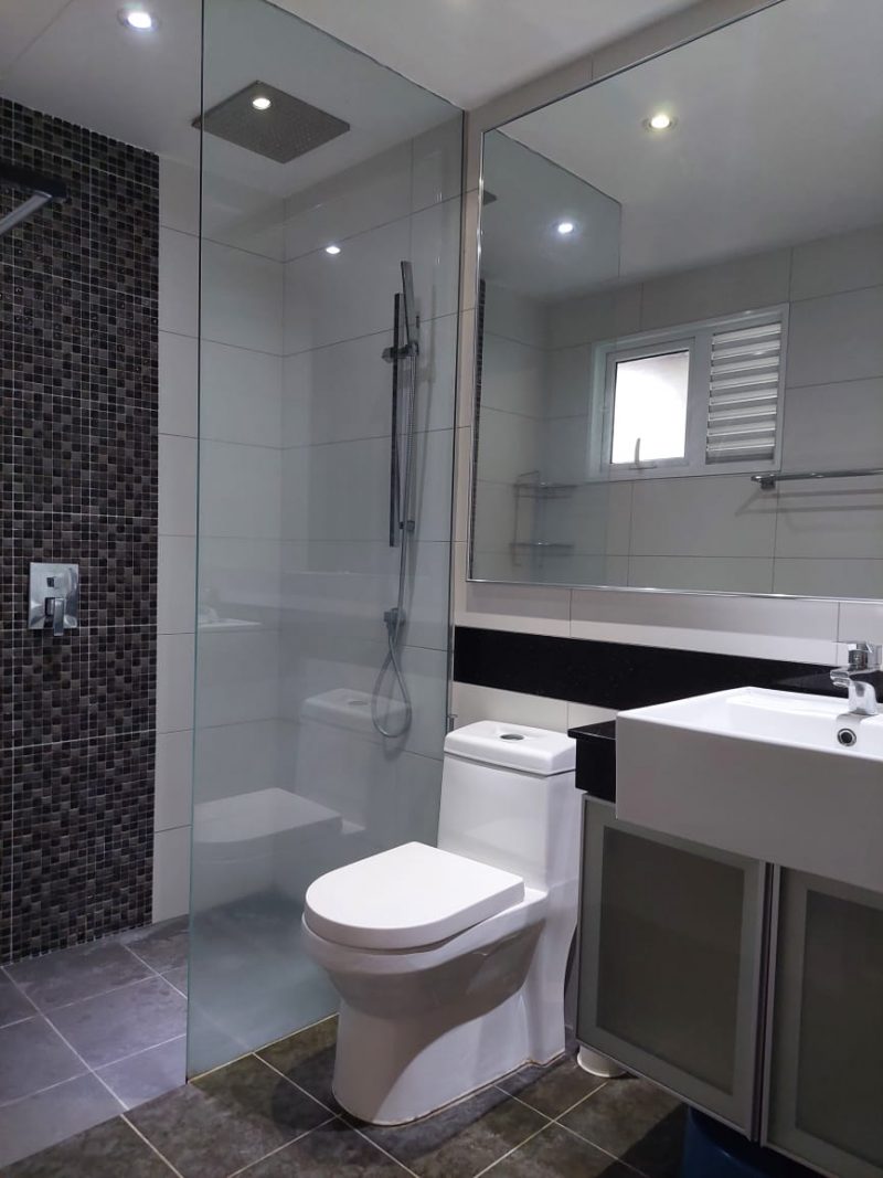 The master bedroom is large, light, and airy owing to glass sliding doors that open up on to the balcony. Full-height built-in wardrobes come complete with TV, telephone, and power points. The en-suite shower room is equipped with modern fittings including a rain shower.